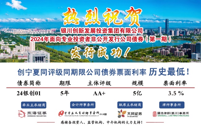 8月30日,銀川創(chuàng)新發(fā)展投資集團有限公司2024年第一期面向專業(yè)投資者非公開發(fā)行公司債券成功發(fā)行。本期債券發(fā)行規(guī)模5億元,期限:5年,票面利率:3.5%,創(chuàng)寧夏區(qū)域內5年期私募債發(fā)行利率歷史最低。本期債券的成功發(fā)行,充分體現(xiàn)了資本市場對銀川市和創(chuàng)投集團的認可,降低了集團融資成本,為集團公司后續(xù)服務銀川市產(chǎn)業(yè)發(fā)展奠定了良好基礎。